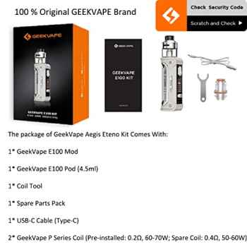 Geek Vape E100 Vape Kit also known as geekvape Aegis Eteno E100 vape starter kit 1.06 TFT inches color screen external single battery 18650 output power 5w-100w maximum output current 35.A maximum output voltage 7.5V Kit made by powerful alloy zinc and screen has also strong protection from water and leakage, having temperature control IP68 technology to maintain dense smoke and produce high quality vapor with e-juice. intelligent working mode A-S Chips 3.0 Inside the box tang with a 510 magnetic adaptor.