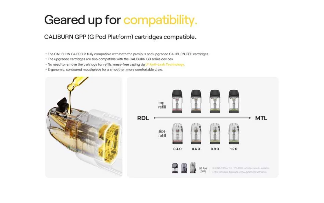Compatibility Compatible with G Pod Platform (GPP) pods include Caliburn G3 and upgrade G4 Pro pods