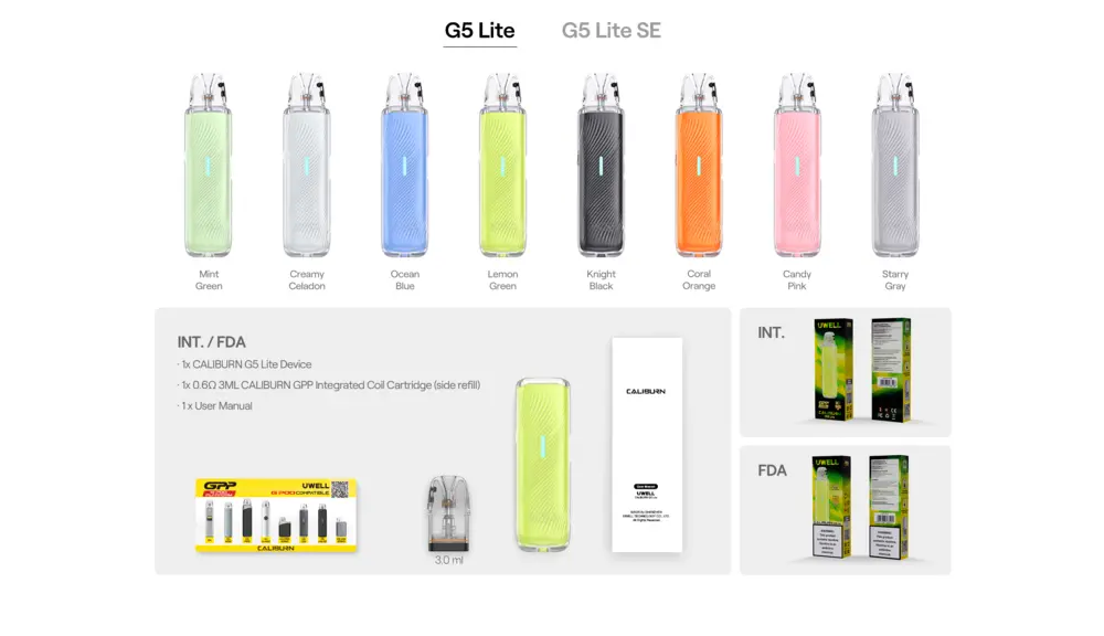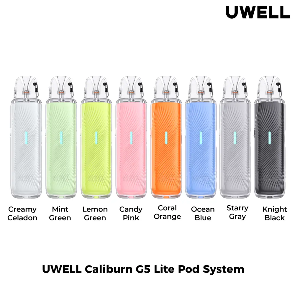 - Uwell G5 lite Colors: Mint Green, Lemon Green, Ocean Blue, Creamy Celadon, Starry Gray, Knight Black, Candy Pink, Coral Orange