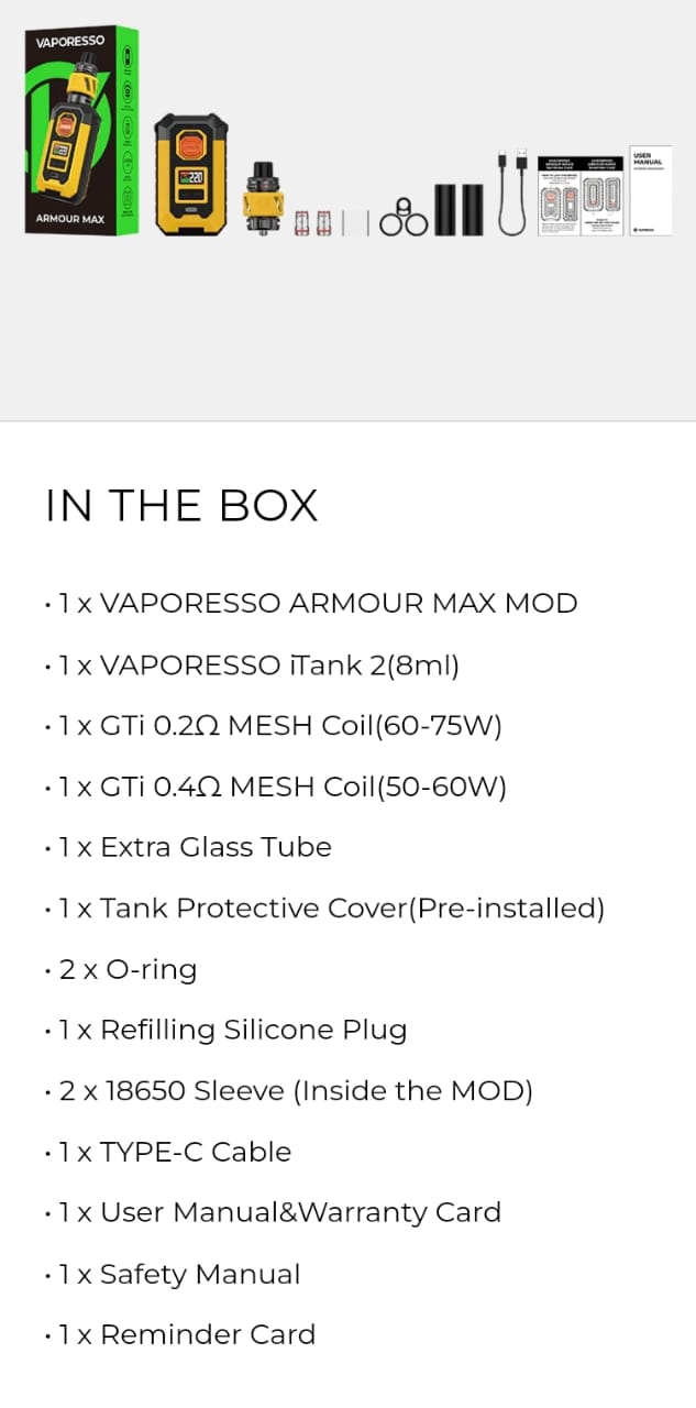 Vaporesso Armour Max Mod 220W to be a dual battery operated 21700/18650 designed for advanced Direct-to-Lung (DTL) vapors which is made from TPU known for its durability and flexibility, making it suitable for protective the kit features a Uni-Lock system, which seems to be a user-friendly mechanism designed to simplify. The kit includes the iTank 2, which is likely an advanced tank designed & features GTi coils, which are designed to provide more accurate taste and have a 50% longer lifespan compared to standard coils