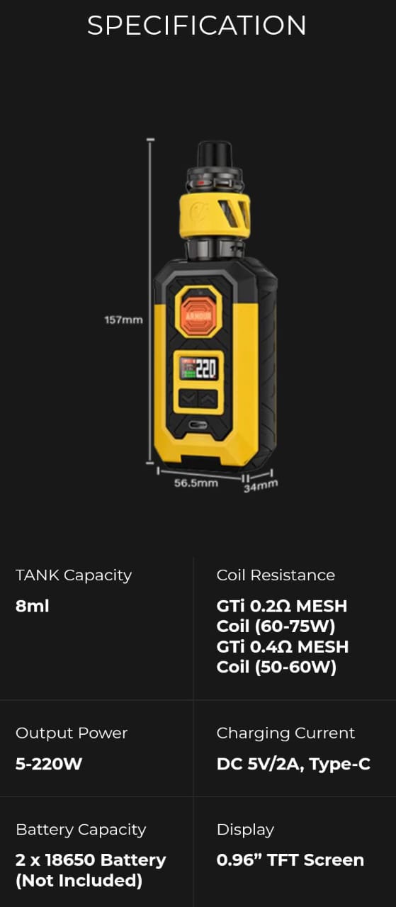 Armour Max Mod by vaporesso 220W compatible with G-T-i coils, which are designed to provide more accurate taste & airflow and have a 50% longer coil life as compared to other coils.