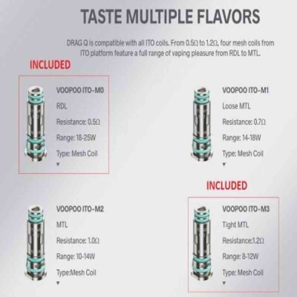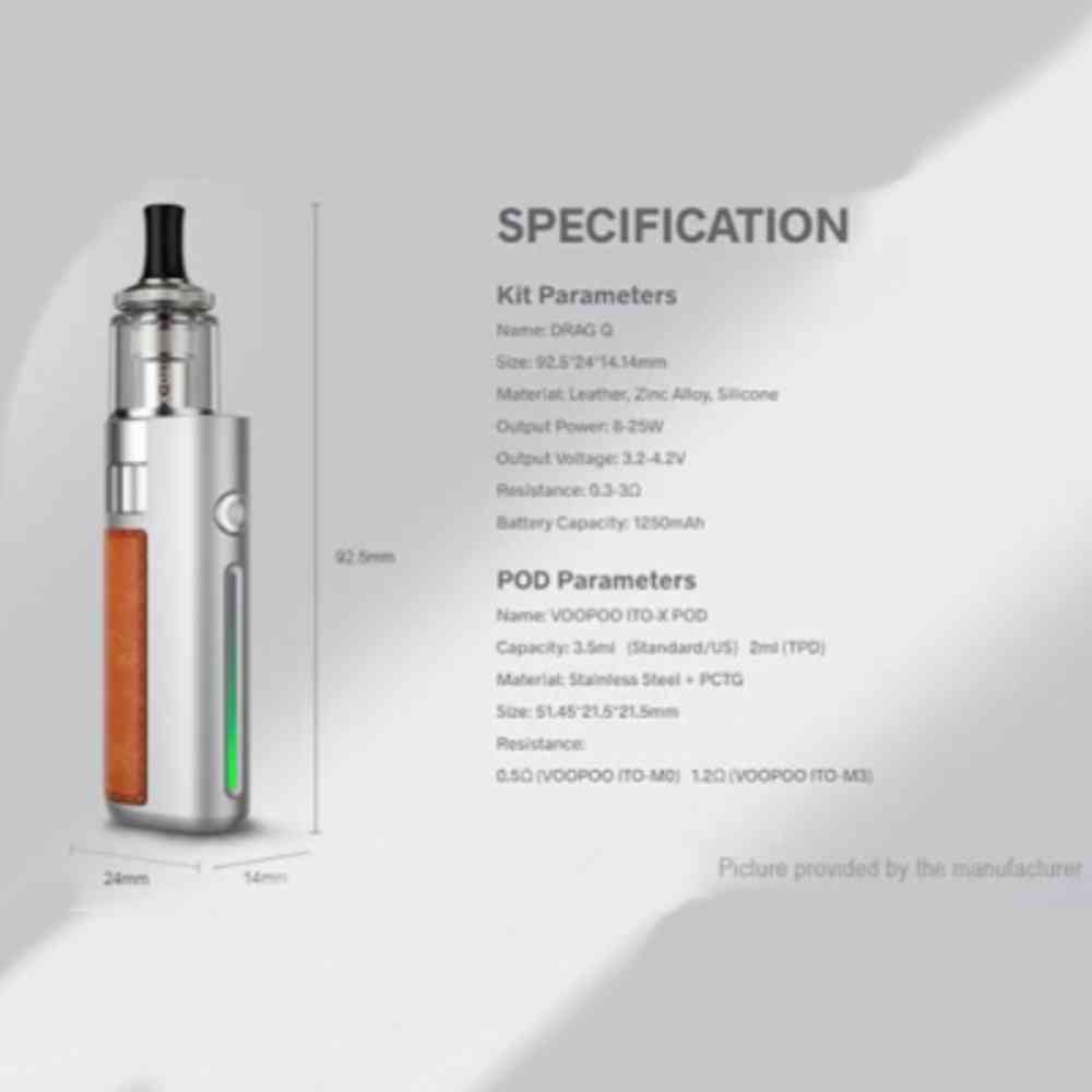 VOOPOO DRAG Q Pod Kit is a newly designed MTL pod system of the popular DRAG family. Powered by a 1250mAh built-in battery, a compact and slim zinc alloy chassis with single fire button and LED indicator light bar, reaching up to 25W output. Adopting the precise airflow control system, the DRAG Q pairs with the 3.5ml refillable ITO-X Pod utilizing a leakproof design, coming with a 0.5ohm ITO coil for RDL vaping and 1.2ohm ITO coil for MTL vaping.