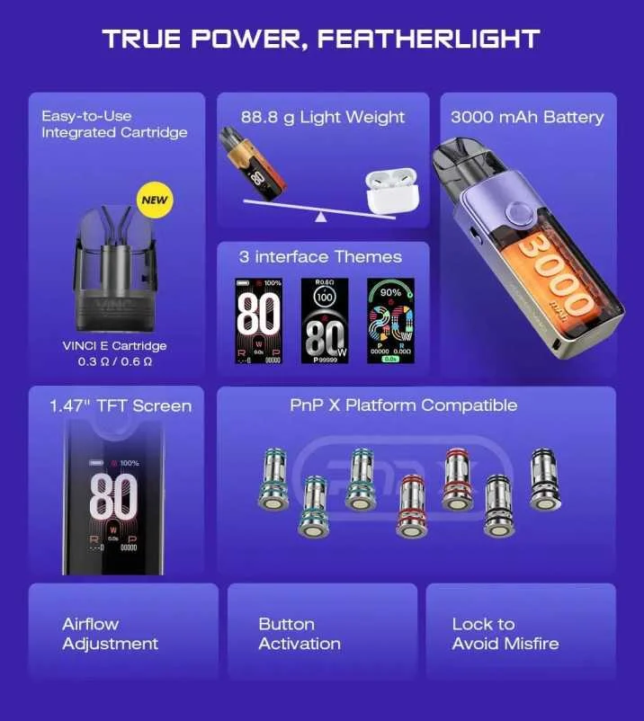 Integrate 3000mAh battery and USB C 2A fast charge, the Vinci E80 is better option for a powerful battery life. With the 0.15ohm PnP DW60 coil enjoy smooth MTL hits with the 0.8ohm PnP-TW15 coil. The innovative airflow control ring allow transition between restricted DL and tight MTL draws.